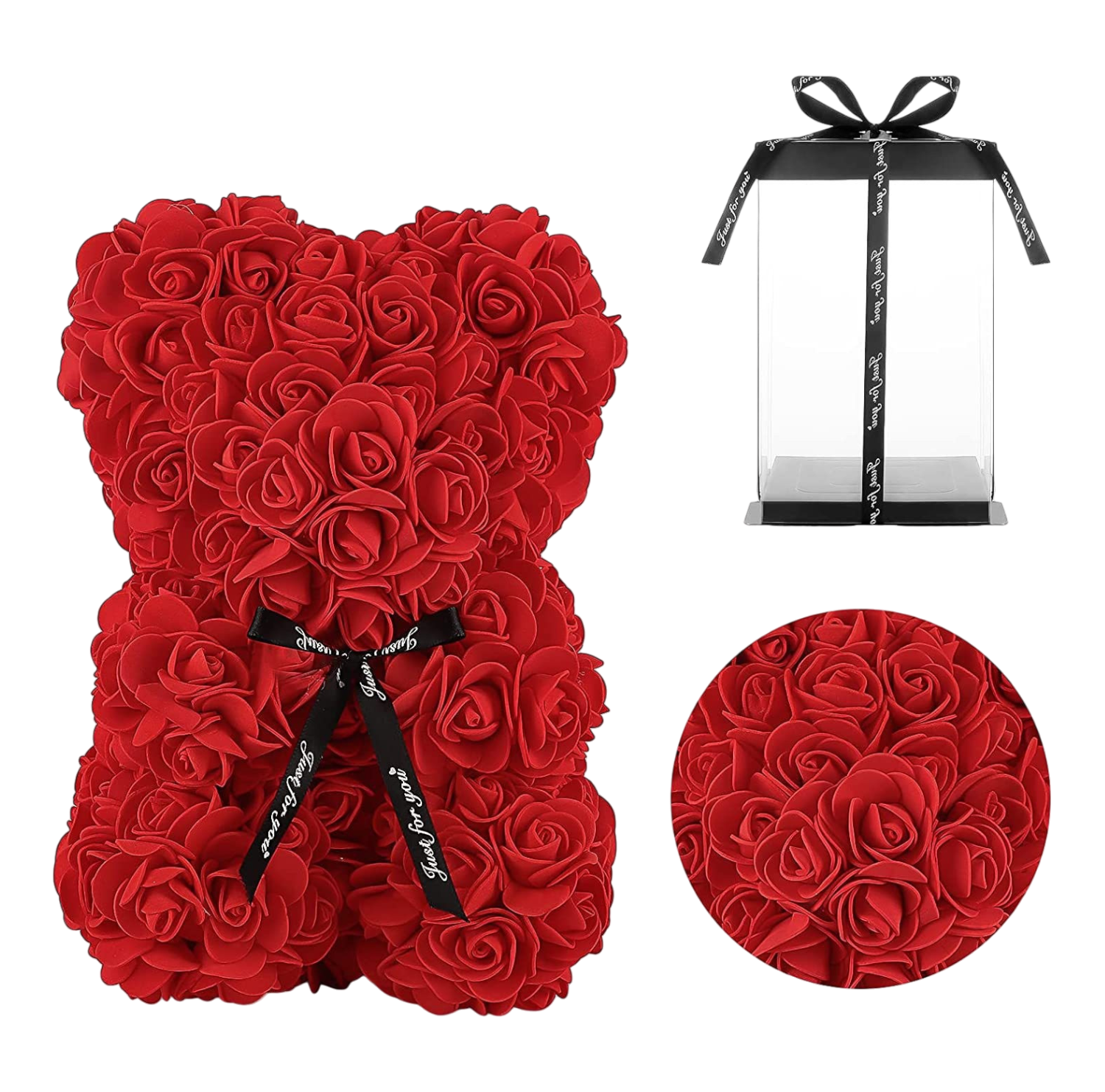 Está elaborado a mano con delicadas rosas de foamy premium (suaves al tacto) que mantienen su forma y color por años. No requiere agua ni cuidados especiales. 🧸🌹